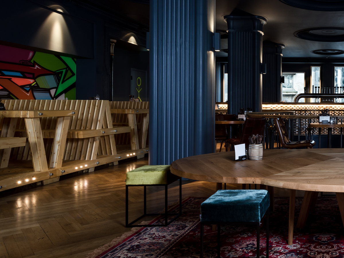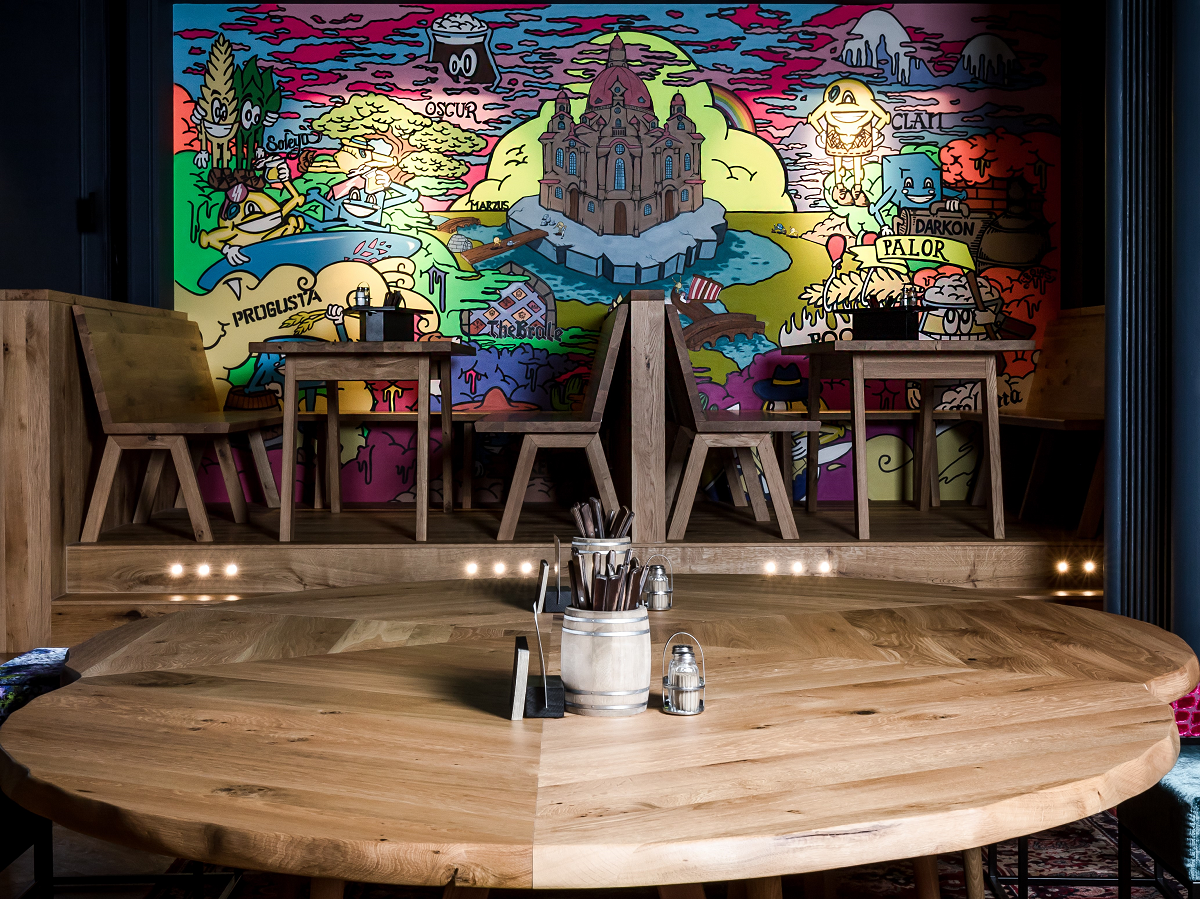 Dieses Mal durften wir ganz rustikale Möbel und Sitzgruppen entwerfen, die für ein einzigartiges Ambiente zwischen Stuck und bunten Graffitis sorgen.