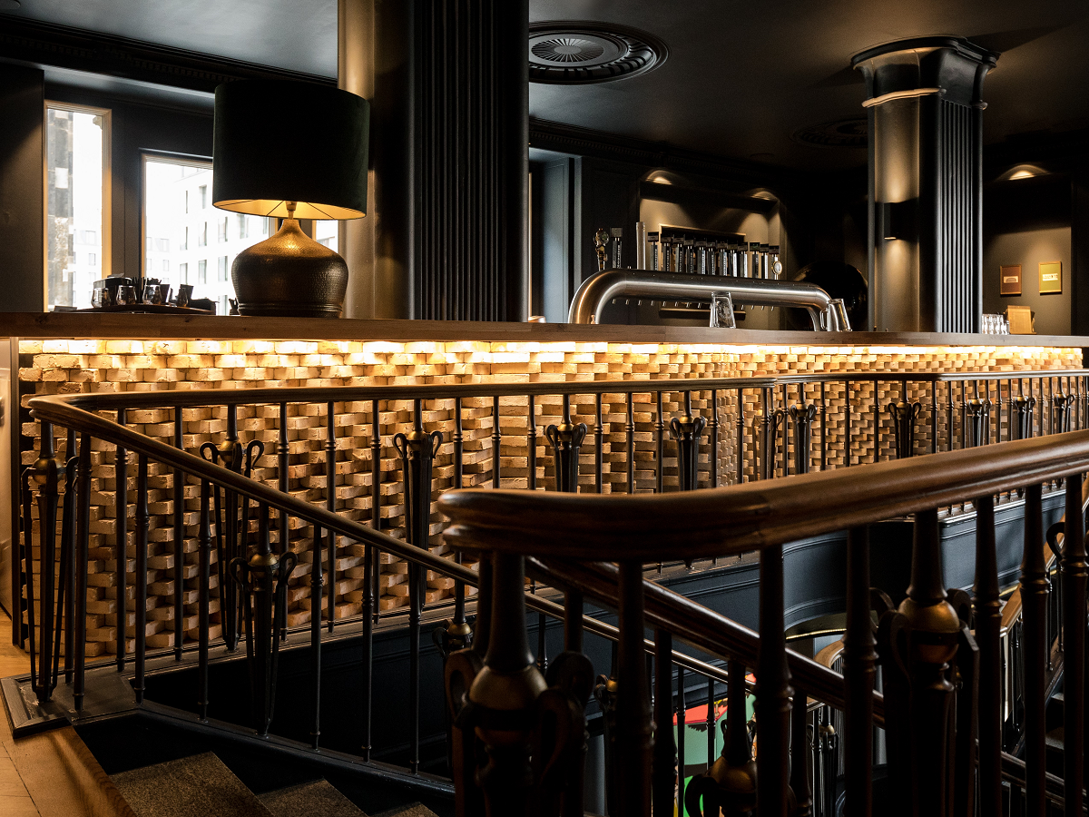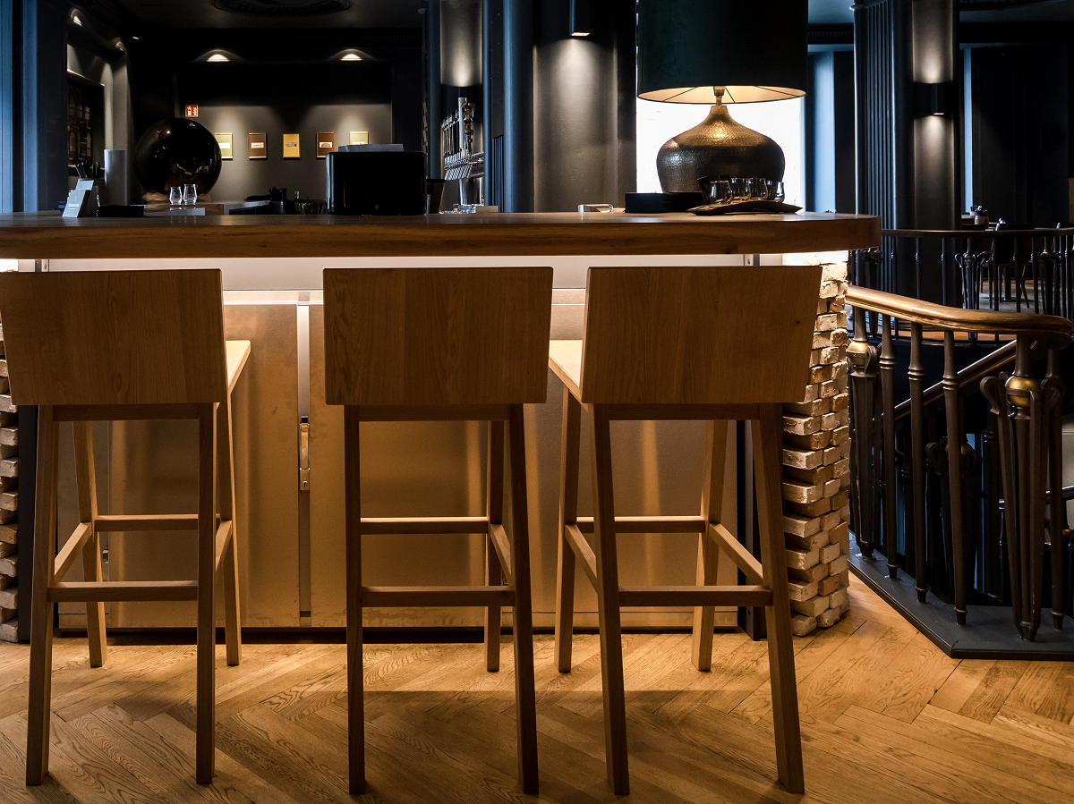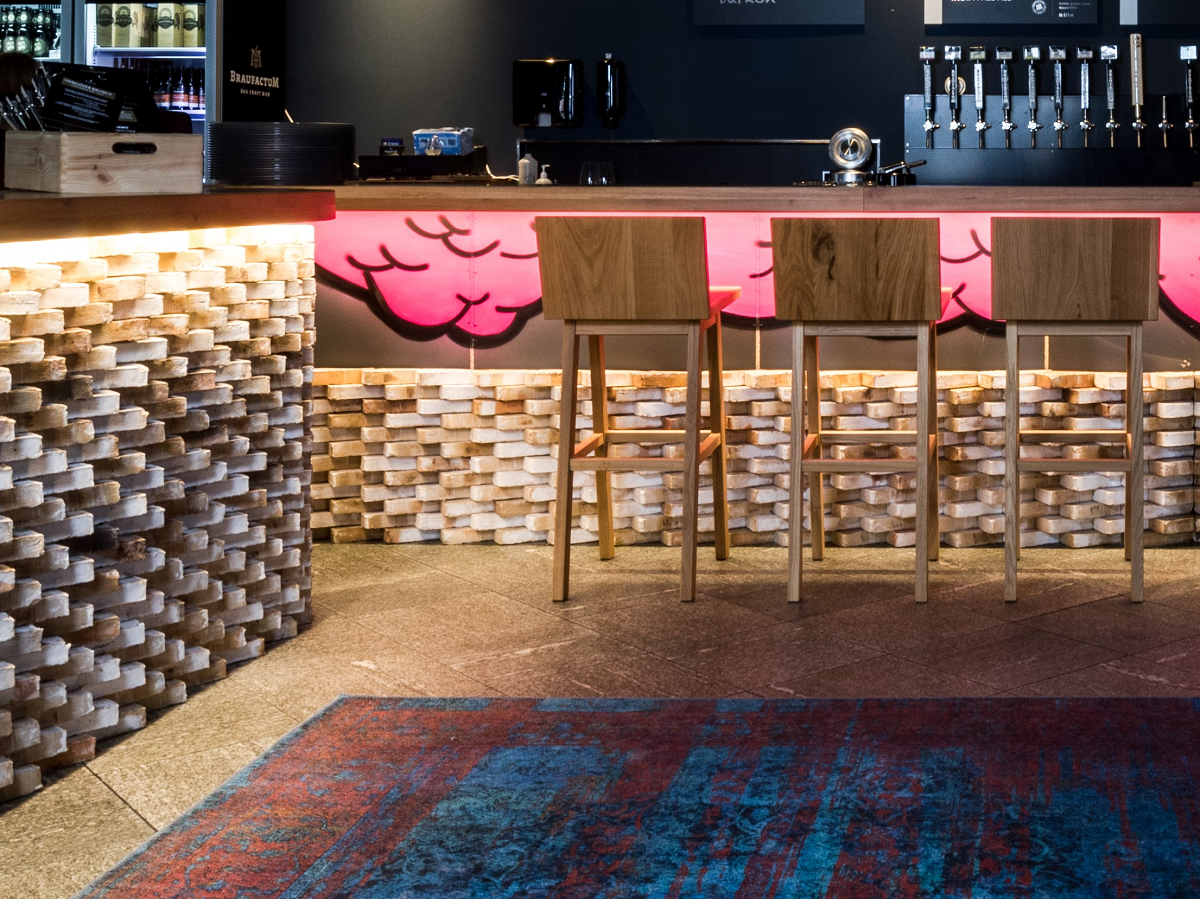 Über beide Etagen sind insgesamt 4 Tresen verteilt. Sie sind aufgebaut auf Korpen mit schwarzem Dekor im Innenbereich, mit einer Arbeitsplatte aus rustikaler Eiche belegt, mit LED unterleuchtet und mit einer Ziegelmauer verkleidet.