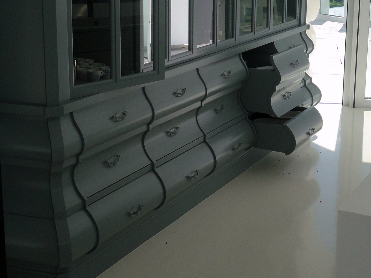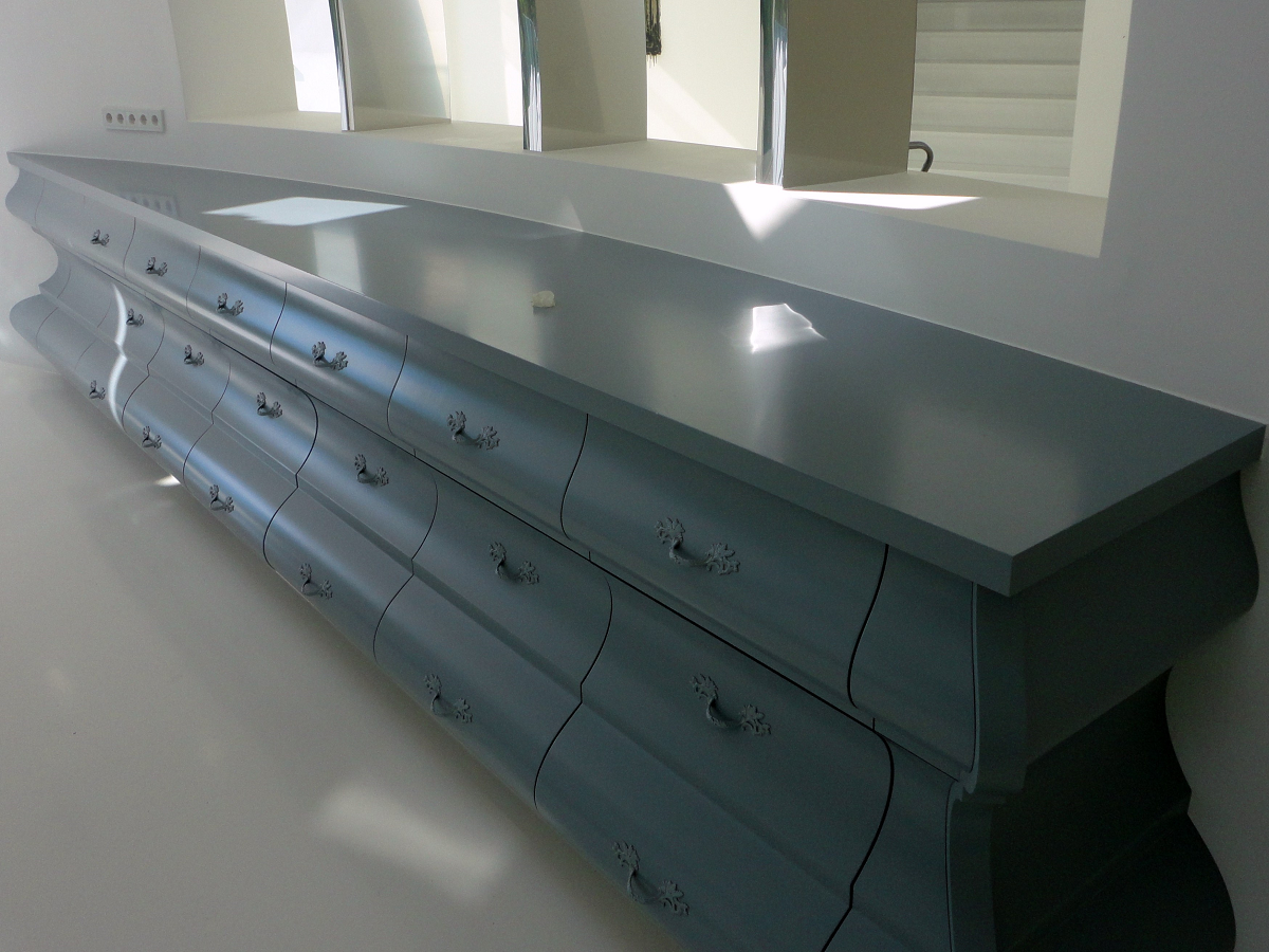 Das Sideboard ist mit formverleimten Fronten konisch an die Wand angearbeitet und mit Schubkästen in verschiedenen Tiefen versehen.